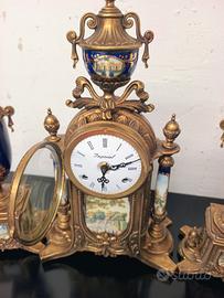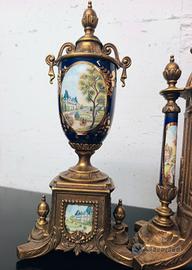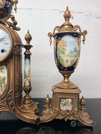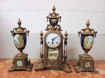 Elegante trittico composto da orologio a pendolo Funzionante e 2 vasi ornamentali. Struttura in bronzo fuso con inserti in porcellana blu cobalto. Orologio Altezza: 41 cm Larghezza: 23 cm Profondità: 12 cm Vasi Altezza: 33 cm Larghezza: 14,5 cm Profondità: 10 cm possibilità di consegna a domicilio