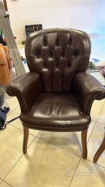 Tris poltrone in pelle color testa di moro, braccioli e piedi in legno. Ottime condizioni
