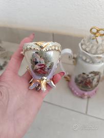 Elegante set da caffè/tè d'epoca in pregiata porcellana artistica, caratterizzato da raffinati decori policromi con scene galanti e finiture in oro zecchino.