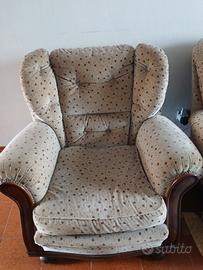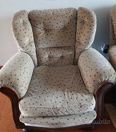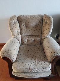 Splendido set da salotto completocomposto da un ampio divano a tre posti e due poltrone abbinate, in perfetto stile vintage anni '70. Il trittico si distingue per le sue linee morbide e l'imbottitura generosa, ideale per chi cerca un arredo che unisca comfort estremo e un'estetica rétro originale. Lo schienale alto e accogliente garantisce un ottimo sostegno, rendendolo perfetto per il relax quotidiano. Misure di ingombro: Divano (3 posti):Lunghezza2 metri, Altezza1 metro, Profondità80 cm. Poltrone (x2):Larghezza90 cm, Altezza100 cm, Profondità80 cm. Dettagli principali: Rivestimento:Tessuto di alta qualità con trama lavorata, morbido al tatto e molto resistente. Colore:Elegante tonalità beige/tortora con dettagli puntinati che donano movimento al tessuto e lo rendono molto pratico. Design:Modello iconico dell'epoca con braccioli imbottiti e caratteristici piedini a vista in legno sagomato. Stile e Design:Si tratta di una poltrona "bergère" con schienale alto, caratterizzata da una struttura inlegno a vista(spesso noce o faggio tinto) e un rivestimento in tessuto con motivo floreale o puntinato. Questo stile è spesso associato a produttori storici comeDoimo Salotti. Dettagli Artigianali:Presenta una lavorazione acapitonnésullo schienale (i bottoni che creano le caratteristiche losanghe) e spesso bordature rifinite conborchie doratelungo il legno. Stato:I mobili sono inottimo stato di conservazione. Le sedute sono ancora molto confortevoli e sode, l'imbottitura non è sfondata. Il set è perfetto per arredare un salone classico, un ufficio o per chi vuole ricreare un angolospace ageautentico in casa propria. Note per il ritiro: Disponibile per il ritiro a mano aMori (TN). I pezzi sono solidi e robusti, quindi richiedono un mezzo adeguato (furgone o van spazioso) per il trasporto.