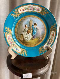 Orologio da tavolo in bronzo dorato e inserti Sevres, coppia di vasi in ceramica dipinta con montatura in bronzo dorato e coppia di piatti in porcellana con scene di genere e oro zecchino