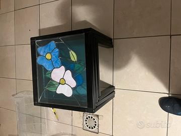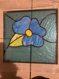 Tavolini trittico con vetri lavorati Tiffany completamente fatti a mano dimensioni chiuso cm 48x48x 40 in altezza aperto cm 48x48x120 ogni tavolino è composto da 3 vetri un vetro trasparente sotto poi il vetro lavorato tiffany e infine un’altro vetro trasparente sopra . NON SPEDISCO
