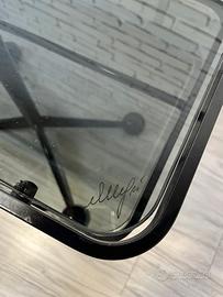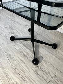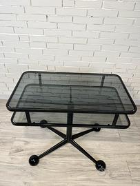 Trolley Allegri Arredamenti Parma, anni ’70, raro modello 78×44 cm, nella versione laccato nero, doppi vetri fumé, altezza regolabile, ruote sferiche, etichetta originale.
