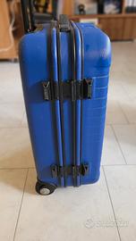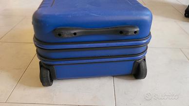 Vendo per inutilizzo un trolley piccolo con struttura rigida a guscio molto robusta, dimensioni 60cm x 40cm x 25cm, colore blu, con divisorio rigido interno, tasca a rete ed elastici per tenere i bagagli. 2 ruote di grande diametro per scorrere bene su terreno anche sconnesso, manico estendibile fino a 93cm di altezza, peso 4.5kg, robuste maniglie su 2 lati, gancio per piccoli oggetti esterni. Doppio sistema di chiusura, di cui uno con combinazione programmabile a 3 cifre e l'altro a cui manca la chiave.