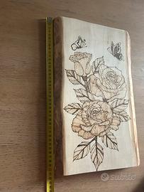 Bellissima serigrafia floreale in tronco di legno grezzo utilizzabile come tagliere o complemento d’arredo
