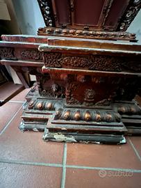 Trono orientale in legno con decori sulla spalliera e lungo il bordo della base, in gesso . Dimensioni Base: cm 50x37x75; Alzata : Largh. 78 cm; Altezza cm 130