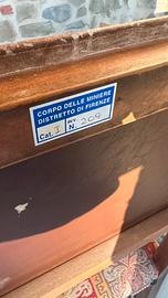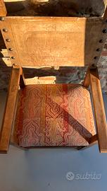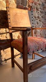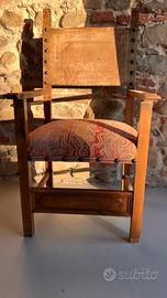 Poltrona/“trono” istituzionale in legno massello, schienale in cuoio decorato con borchie, seduta originale imbottita con tessuto d’epoca. Mai restaurata, ottimamente conservata: presenta normali segni d’uso coerenti con l’età. Targhetta sul retro che ne attesta la provenienza di inizio secolo dal Corpo delle Miniere — Distretto di Firenze (vedi foto). Disponibile per visione. Spedizione/trattativa da concordare.