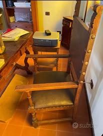 Bellissimo trono stile rinascimentale in legno di noce e cuoio.
