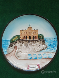 Il piatto mette in evidenza come rappresentazione principale il Santuario di Santa Maria dell'Isola di Tropea. Questo Santuario appartenuto originariamente ai monaci basiliani e poi ai benedettini, ha una bellissima chiesa di origine medioevale, il Santuario di Santa Maria dell'isola di Tropea, è sicuramente il simbolo più noto di Tropea, anche a livello internazionale. Sorge su un'isolotto conosciuto come Isola Bella, in una posizione incantevole. La si può ammirare dai belvedere del centro storico e anche dal lungomare e dalle spiagge. Si raggiunge tramite una scalinata ricavata dalla roccia che è anche panoramica. Da qui infatti c'è una bellissima vista su entrambi i lati della costa. Anche dalla chiesa stessa il panorama è bellissimo. L'interno è molto più piccolo di quello che si può pensare. La leggenda narra che la statua della Madonna arrivò via mare dall'Oriente. Il Sindaco ed il Vescovo decisero di posizionarla in una grotta naturale ....
