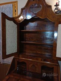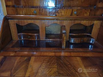 Trumeau in radica di noce intarsiata, tenuto perfettamente senza difetti, ribaltina e cassetti funzionanti.