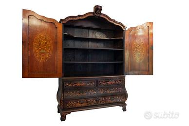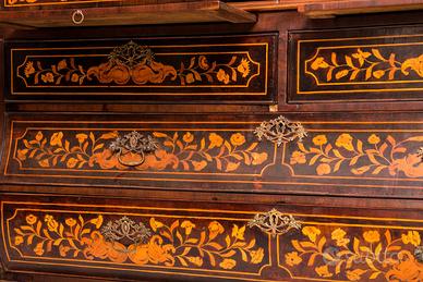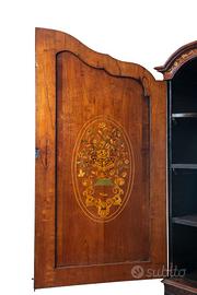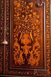 Trumeau costruito in legno di rovere, che non tarla, rivestito in legno di mogano, con intarsi in legni di frutto come pero e limone, con motivi floreali. Mobile a due corpi intarsiato usato per conservare oggetti preziosi e carte di valore. Il corpo superiore ha la cimasa mossa, i fianchi lisci e due sportelli. Il corpo inferiore ha fronte e fianchi mossi, due cassetti allineati e due cassetti sottostanti. La ferramenta è tutta originale della sua epoca. E’ stato eseguito un ottimo restauro finalizzato alla conservazione del manufatto ed al ripristino delle sue funzioni estetiche e di uso.