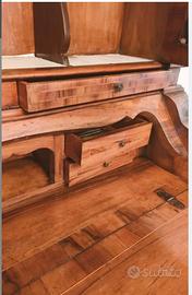 Trumeau a doppio corpo, un mobile antico lastronato in noce e radica di noce, piccole cornici intarsiate in contrasto ne risaltano la forma, probabilmente di manifattura veneta del XVIII. Ribalta che diventa piano da appoggio se aperta contenente cassetti e vano centrale, corpo superiore composto da due ante con specchi molati, all'interno una serie di ripiani. Corpo inferiore sagomato, composto da tre cassettoni.