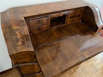 Il mobile è un elegante scrittoio a ribalta ottocentesco in stile barocchetto, con tarsie floreali di buona fattura e struttura in noce. È un pezzo decorativo, autentico e gradevole, perfetto per ambienti classici o come elemento di contrasto in un contesto moderno. Non è un mobile del ’700, ma un ottocento di qualità, con un valore antiquariale oggi ridimensionato, ma comunque interessante.
