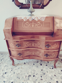 Vendo credenzina in noce intarsiata con specchiera, come da foto. Ottimo stato. Solo consegna a mano con pagamento in contanti.
