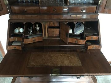Il piano di scrittura è arricchito da un inserto in pelle con bordatura impressa in oro, ideale per l'uso come secretaire.