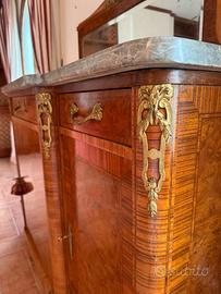 Trumò con specchio molato, tre cassetti e tre sportelli comunicanti, tre ripiani. Piano in marmo grigio indiano. Misure: 150 lunghezza, 52 profondità, 103 altezza. Specchio lunghezza 111, altezza 46. SOLO ritiro sul posto: zona Sutri (VT)
