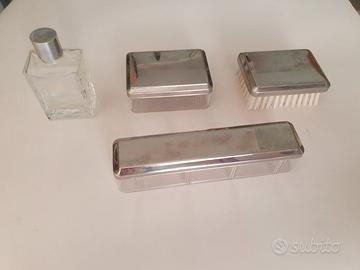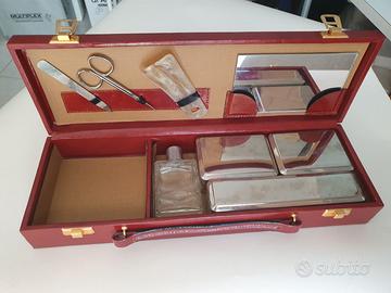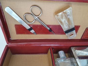 Trusse da viaggio elegante in pelle marrone, con interno specchio 12,5 x 8 cm. + calzatore osso, forbicine unghie, limetta unghie, spazzola 8,7 x 6 cm. + recipiente per sapone 8,7 x 6 cm. custodia per spazzolino 16,5 x 3,8 cm. + contenitore per profumo in vetro, spazio per orologio o gioielli. Perfetto per regalo. Buono stato. Dimensioni cofanetto 35,5 x 12 x 5,8 cm € 30,00 + sp. Sped. Posso spedire ovunque in Italia (+ € 10,00) con tracciamento del pacco o se si desidera controllare di persona ed eventualmente ritirare a Roma. Visto il modesto valore d’oggetto preferisco consegna a mano a ROMA quartiere INFERNETTO.