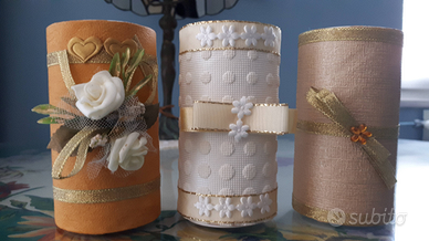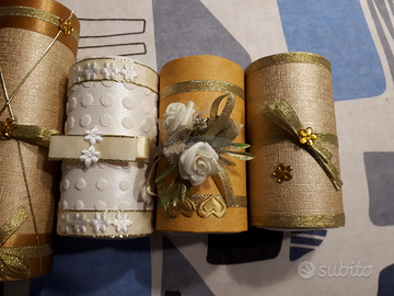 Mi sono rimasti 2 tubi medi, decorati con fiori e altre decorazioni, dentro vuoti, apribili con tappo. Ideali per una pergamena speciale o una bomboniera o semplicemente come porta regalo o porta auguri che rimane per sempre. Dimensione: 18cm, diametro 5cm. Prezzo di un tubo 5 euro. Ho a disposizione altri pezzi più grandi e più piccoli di vari colori. Mi trovo a Morena.