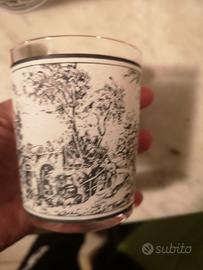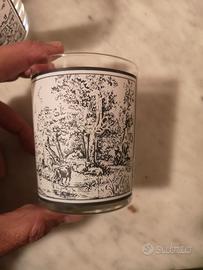 Set di 4 bicchieri tipo tumbler con una stampa in bianco e nero di una scena rurale o storica, che ricorda lo stile delle stampe litografiche di un tempo.