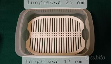 set composto da due vaschette impilabili, una griglia per evitare il contatto degli alimenti con il fondo del contenitore e un coperchio ermetico