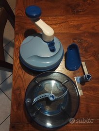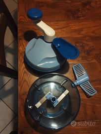 Tupperware tritatutto manuale con base diam 15 cm. Due accessori uno con lame e uno con sbattitore, permettono oltre che tritare anche di sbattere e montare. La base è con inserto di plastica antiscivolo. La parte del coperchio ha il macinino con comoda impugnatura e movimento circolare, con apertura per inserire olio o liquidi, esempio per montare la maionese. Ha un imbuto graduato che si incastra perfettamente nel coperchio. Ha anche il tappo di chiusura ermetico per conservare ciò che si è macinato. Vendo causa troppi utensili in cucina.