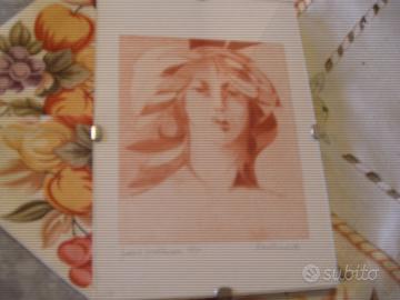 Incisione del 1990 del pittore faentino Pietro Turchetti, attivo per tantissimi anni nella provincia di Bologna. La belleza delle donne era il suo soggetto principale. La puntasecca "sanguigna" è firmata a matita in basso a destra, e datata, sempre a matita in basso a sinistra, dove è scritto probabilmente anche il luogo di esecuzione, non decifrabile. Le condizioni sono ottime, e l'opera è disposta "a giorno", cioè sotto vetro ma senza cornice. L' artista nacque nel 1922, ed è vissuto fino al 2010. L'incisione misura cm 30x21.