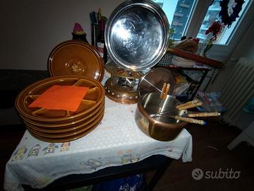 Lampada per FLAMBARE a Gas con Teglia Grande X Crepes e Casseruola per Fondu', compresi 6 PIATTI FRANCESI PER FONDU' con Giglio Sotto.
