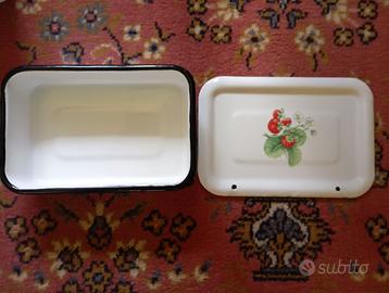 1). Grande contenitore smaltato con coperchio per cucinare e conservare gli alimenti. Dimensioni: 30 x 22,5 cm, profondità 5,5 cm. Il contenitore è intatto, ma presenta una scheggiatura nello smalto all'estremità del coperchio. Prezzo: 10 euro;