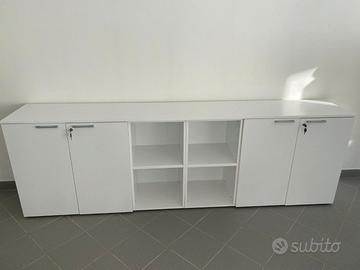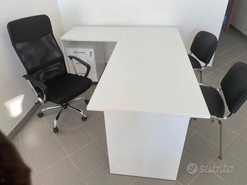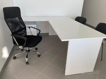 Ufficio operativo composto da: 1 scrivania fianco legno da 180x80 cm con allungo laterale da 80 cm colore bianca; 1 cassettiera a 3 cassetti con chiusura simultanea dei cassetti e ruote autofrenanti sotto; 1 poltrona operativa con struttura in acciaio e con schienale e seduta in rete traspirante; 2 sedie fisse a 4 gambe con struttura in acciaio cromato e rivestite in ecopelle rigida; 1 composizione di mobili fatta da due mobili da 90x45x85 cm con ante in legno e 1 mobile da 45x45x85 cm senza ante , il tutto legato da top di finitura.