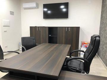 Ufficio completo colore eucalipto composto da scrivania direzionale da 200cm poggiata su mobile di servizio;tris di poltrone fatto da 1 poltrona presidenziale su ruote e due attesa su slitta ; Composizione di mobili composta da due da 90x45x127 cm con ante di finitura e un mobile da 45x45x127 cm senza ante e con top di finitura.
