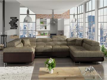 Divano letto matrimoniale angolare ad U con box contenitore, in 17 combinazioni di colori moda, senza variazioni di prezzo! Divano letto matrimoniale angolare con box e penisole ad U Berlino: la versione angolare ad U del nostro modello best seller Stoccolma, già apprezzato dai nostri clienti per il suo design attuale e ricercato e per la sua dotazione di 4 poggiatesta reclinabili, particolarmente utili per ottenere il massimo del relax, che ritroviamo anche nel modello Berlino. Le dimensioni di questo divano sono ampie ed importanti, oltre che nella profondità della seduta (58 cm), soprattutto per quanto riguarda la penisola e il lato ad angolo, che hanno la medesima lunghezza (202 cm), rendendo questo modello perfetto per arredare con eleganza la zona living. Il modello Berlino è dotato di funzione letto con sistema relax e di un praticissimo e funzionale box contenitore ed è costituito da due lati della medesima lunghezza che sono però asimmetrici nella forma, per questo motivo è necessario scegliere la posizione dell’angolo, che si posiziona dalla parte del lato completo di bracciolo. Il divano Berlino è un prodotto di qualità e pesa 195 Kg! Sottolineiamo che il rivestimento della funzione letto che fuoriesce può essere di colore diverso da quello evidenziato in foto e comunque non è in tinta ed è differente dalla combinazione di colore del divano che si sceglie. Guarda anche le altre versioni del modello Berlino: Stoccolma, Dortmund e Thailandia! Misure: lunghezza 340 cm – altezza 70/90 cm – profondità 202/202 cm – dimensione letto 125×253 cm EXCELLENT LINE – GARANZIA DI 2 ANNI COME DA NORMATIVA EUROPEA STRUTTURE INTERNE E RIVESTIMENTI MOLTO RESISTENTI PRODOTTO ROBUSTISSIMO E DI ALTA QUALITA’!