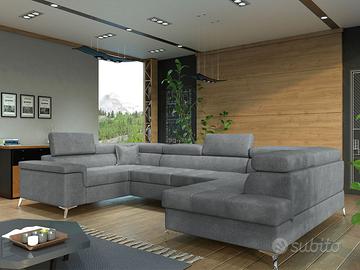 Divano letto matrimoniale angolare ad U dotato di box contenitore, in 11 affascinanti colori, senza variazioni di prezzo! Un divano letto angolare con box veramente splendido e che si distingue ed eleva non soltanto fra i nostri modelli ma anche fra tantissime proposte commerciali presenti sul mercato è senza dubbio il modello Arkansas. I motivi sono molteplici: in prima istanza il design moderno e di ultima concezione, le bellissime colorazioni in cui è proposto, le ampie dimensioni complessive e la qualità della lavorazione generale e dei suoi materiali costitutivi, che ne fanno un divano di altissimo pregio e di ottima fattura, tanto che il suo peso complessivo è di ben 225 Kg! Per quanto riguarda le due penisole hanno identica lunghezza ma differiscono poiché una ha il bracciolo all’estremità mentre l’altra è dotata di ampio angolo con seduta ai lati. Altra importante caratteristica distintiva del divano letto angolare con box a U sono i 4 poggiatesta reclinabili con movimento fine corsa, di cui due collocati nella parte centrale ed altri due posizionati nella parte esterna delle penisole, uno di fronte all’altro. I piedi di sostegno del modello Arkansas, realizzati in metallo e molto robusti, sono anche molto attrattivi nell’estetica e nel design. La qualità più importante del divano letto Arkansas è quella di avere un rapporto qualità/prezzo elevatissimo, tanto che sebbene dotato di tutte le caratteristiche sopra esposte il prezzo di vendita è decisamente contenuto! Specifichiamo che nel prezzo di vendita sono compresi i due cuscini di bellezza visibili nelle foto e dello stesso colore del divano; sottolineiamo che nella versione di colore rosso sono presenti i due cuscini di bellezza in tinta unita e non i tre cuscini differenti indicati nelle foto. Divano angolare robustissimo e di ottima qualità, dal peso di ben 225 Kg! Sottolineiamo che il rivestimento della funzione letto che fuoriesce può essere di colore diverso da quello evidenziato in foto e comun