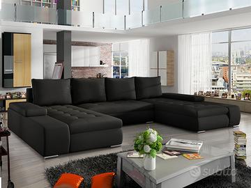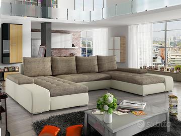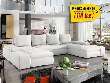Divano ad U con box, provvisto di 1 pratico box contenitore, disponibile in 12 combinazioni di rivestimento, ad egual prezzo. Divano ad U con box – Bahamas, ha una bellissima linea molto raffinata ed essenziale e si caratterizza per avere 2 penisole di medesima lunghezza e braccioli bassi, nella parte anteriore delle penisole i braccioli in ecopelle sono a livello della seduta. Ideale per arredare una zona giorno in stile moderna, si presta anche ad essere inserito in contesti di varia natura stilistica. Nella parte centrale è dotato di pratico box contenitore e con un semplice movimento è trasformabile in letto matrimoniale. Divano ad U con box di qualità, robusto e dal peso di 188 Kg! EXCELLENT LINE – GARANZIA DI 2 ANNI COME DA NORMATIVA EUROPEA STRUTTURE INTERNE E RIVESTIMENTI MOLTO RESISTENTI PRODOTTO ROBUSTISSIMO E DI ALTA QUALITA’! SCHEDA TECNICA: Struttura divano: legno massello, legno semilavorato e legno artificiale. Cinghie di sostegno in ferro. Seduta: imbottitura in uno strato di schiuma di poliuretano alta resilienza dalla densità di 40 kg/m3. Braccioli e schienale: imbottitura di schiuma di poliuretano dalla densità di 30 kg/m3 Piedi: in metallo colore cromato Rivestimento in tessuto: 100% poliestere di alta qualità, resistente agli strappi e all’usura Rivestimento in ecopelle: 100% PU ad alta grammatura (425 g/m2), idrorepellente, morbida al tatto e resistente agli strappi e all’usura Pulizia del rivestimento in tessuto: la pulizia del tessuto deve essere effettuata sul posto con le schiume a secco apposite, con i pulitori a vapore (100 gradi) o con le aspirapolveri ad acqua per tessuti. Questo divano non è sfoderabile. Pulizia del rivestimento in ecopelle: essendo l’ecopelle idrorepellente, la pulizia di tale rivestimento deve essere effettuata semplicemente con un panno umido ammorbidito in acqua tiepida. Divano di grande qualità molto elegante, raffinato, pratico e funzionale dal peso di ben 188 kg!