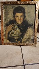 La figura è raffigurata frontalmente con uno sguardo penetrante e profondamente contemplativo. L'espressione del viso oscilla tra innocenza e dolore, costituendo il nucleo emotivo dell'opera e instaurando un dialogo silenzioso ma diretto con l'osservatore.