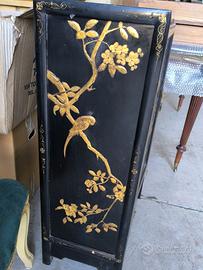 mobile orientale laccato nero con decorazioni dorate in rilievo, raffiguranti uccelli e rami fioriti (motivi tipici della tradizione cinese).