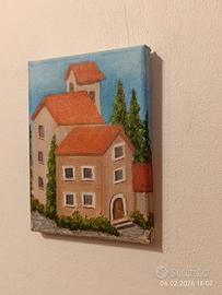 Un piccolo dipinto con delle case. Pittura positiva.