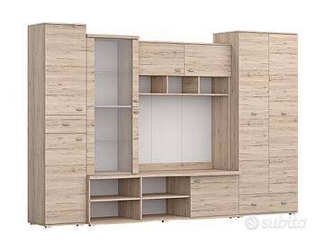 La parete attrezzata Oviedo, con pratico vano appendiabiti, è un set di mobili elegante e funzionale, perfetto per il soggiorno, che combina spazio di archiviazione ed estetica; è ideale sia per un soggiorno ampio e aperto che desideriamo organizzare in modo originale e caratteristico, sia per un soggiorno più piccolo, dove ci permetterà di sfruttare al massimo lo spazio. La parete attrezzata offre ampio spazio contenitivo, i piani di lavoro arrotondati conquisteranno con la loro forma moderna e la vetrina con frontale ovale in vetro metterà in risalto i vostri decori preferiti. L’unità a parete non ha la piastra tra la presa TV e la prolunga/ripiano. La parete attrezzata modello Oviedo, realizzata con materiali di qualità, è semplice da montare e non richiede l’impiego di tasselli per il fissaggio alla parete. Il peso di questa parete attrezzata è di ben 230 kg!