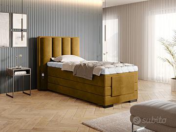 Il letto motorizzato singolo boxspring Belize è la nuovissima versione singola del nostro modello Utrecht. Il sistema di riposo del letto motorizzato boxspring Utrecht è senza dubbio tra i migliori e confortevoli presenti sul mercato e questo dipende dalla sua struttura e dalla sua conformazione: il materasso sfoderabile a molle indipendenti, sul quale è posto il top sfoderabile, poggia su di un altro materasso a molle tradizionali fisso, che ha la medesima funzione di sostegno che svolgono normalmente le reti. Questa sovrapposizione dei due materassi fà sì che il materasso a molle indipendenti sia estremamente ricettivo alle sollecitazioni ed agli impulsi che gli vengono trasmessi: per i numerosi elementi della sua struttura, l’altezza complessiva di dove si dorme è di ben 67 cm. Oltre a questo aspetto, il letto motorizzato boxspring Belize è dotato di un meccanismo elettrico in 4 sezioni costituito dai movimenti: spalle, bacino, gambe e piedi. Il meccanismo elettrico del modello Belize è controllabile tramite il suo telecomando. La dotazione del nostro letto motorizzato Belize è davvero completa, sia per il livello di qualità del riposo sia per quanto riguarda la funzione di aiuto per alzarsi e coricarsi ed è indicato per ogni persona, in particolare per persone con difficoltà nelle funzioni motorie. Infine, la testata del modello Belize è di importanti dimensioni (H 130 cm) ed è caratterizzata da motivi lineari verticali che lo rendono un letto moderno e versatile. Letto con box contenitore robustissimo dal peso complessivo di ben 111 kg. EXCELLENT LINE – GARANZIA DI 2 ANNI COME DA NORMATIVA EUROPEA STRUTTURE INTERNE, RIVESTIMENTI E MOTORI MOLTO RESISTENTI PRODOTTO ROBUSTISSIMO E DI ALTA QUALITA’!