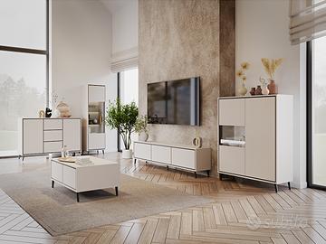 Trasforma il tuo spazio living in un ambiente di raffinata eleganza con la collezione Johannesburg. Questo set di mobili eleganti in stile moderno unisce la funzionalità di contenimento alla possibilità di esporre oggetti dal punto di vista estetico rappresentano la perfetta combinazione di funzionalità e design minimalista. Decorato in una delicata tonalità cashmere, si adatta perfettamente a diversi contesti, e la sua forma minimalista è enfatizzata da inserti neri e sottili gambe in metallo dal design minimalista, che privilegia la semplicità e la modernità. Il sistema push-to-open consente di aprire comodamente i frontali senza maniglie. Misure: Mobile porta TV a 3 ante , gambe in metallo nero e sistema PUSH TO OPEN: lunghezza 180 cm – altezza 55 cm – profondità 40 cm Vetrina Bar 2 ante dotata di 1 ripiano aperto , 5 ripiani chiusi , gambe in metallo nero e sistema PUSH TO OPEN: lunghezza 100 cm – altezza 135 cm – profondità 40 cm Vetrina alta 1 anta in vetro dotata di 5 ripiani , gambe in metallo nero e sistema PUSH TO OPEN: lunghezza 50 cm – altezza 185 cm – profondità 40 cm Cassettiera dotata di 2 ante con ripiani , 3 cassetti , gambe in metallo nero e sistema PUSH TO OPEN: lunghezza 150 cm – altezza 100 cm – profondità 40 cm Tavolino da caffè dotato di 2 vani portaoggetti , gambe in metallo nero e sistema PUSH TO OPEN: lunghezza 90 cm – altezza 45 cm – profondità 65 cm Materiali robusti e di qualità: pannello laminato spesso 16 mm Maniglie in PVC bordi rifiniti completamente con impiallacciatura in PVC Pulizia: utilizzare acqua tiepida e detergenti neutri, usando panni delicati antigraffio. Asciugare tutto subito appena si è finito di pulire. Desideri ulteriori informazioni? Contattaci al numero (anche WhatsApp), siamo a tua disposizione!