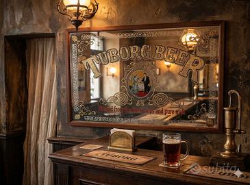 Hai un angolo della casa che ti sembra un po' spento? O forse stai cercando quel pezzo unico per rendere la tua taverna il posto preferito dei tuoi amici? Ti presento questo splendido Specchio Pubblicitario Vintage della Tuborg Beer. Non è solo un oggetto, è un vero e proprio viaggio nel tempo, un pezzo di storia delle birrerie che porta con sé tutto il fascino degli anni '70 e '80. La grafica è curatissima, con la coppia elegante al centro e i dettagli dorati che catturano la luce in modo stupendo. È il mix perfetto tra eleganza retrò e spirito "industrial". Come puoi vedere dalle foto, lo specchio è stato conservato con cura. Qualche piccolo segno del tempo sulla cornice non fa che raccontare la sua storia, rendendolo ancora più autentico. 🏠 Dove sta bene? È l'ideale sopra un bancone bar, in una cucina dallo stile rustico o moderno, o magari nel tuo ufficio per dare un tono originale all'ambiente. È anche un'idea regalo incredibile per quell'amico che non rinuncia mai a una buona bionda! 🍺 📏 Dimensioni: 66x50cm