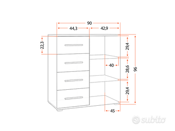 Comò: larghezza 90 cm – altezza 96 cm – profondità 45 cm