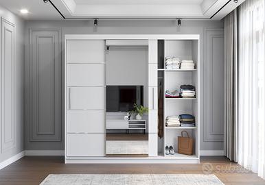L’armadio a tre ante scorrevoli è il punto focale della stanza. Le ante scorrevoli, oltre a essere pratiche, conferiscono un tocco di modernità all’ambiente. Il grande specchio centrale, elemento distintivo dell’armadio, non solo riflette la luce e fa sembrare la stanza più spaziosa, ma offre anche una superficie ideale per controllare il proprio look.