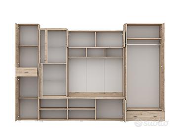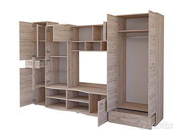 La parete attrezzata Oviedo, con pratico vano appendiabiti, è un set di mobili elegante e funzionale, perfetto per il soggiorno, che combina spazio di archiviazione ed estetica; è ideale sia per un soggiorno ampio e aperto che desideriamo organizzare in modo originale e caratteristico, sia per un soggiorno più piccolo, dove ci permetterà di sfruttare al massimo lo spazio. La parete attrezzata offre ampio spazio contenitivo, i piani di lavoro arrotondati conquisteranno con la loro forma moderna e la vetrina con frontale ovale in vetro metterà in risalto i vostri decori preferiti. L’unità a parete non ha la piastra tra la presa TV e la prolunga/ripiano. La parete attrezzata modello Oviedo, realizzata con materiali di qualità, è semplice da montare e non richiede l’impiego di tasselli per il fissaggio alla parete. Il peso di questa parete attrezzata è di ben 230 kg!