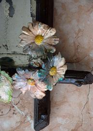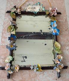 Una splendida specchiera liberty (ultimi 20 anni del 1800) in ceramica dipinta, della manifattura Nove- Bassano, con applicazione di fiori colorati. L’oggetto, dotato del suo specchio originale al mercurio (che ne aumenta di molto il valore), rientra in quel gusto per gli arredi da giardino d’inverno o di architetture rustiche di moda nel sec. 1800. La specchiera è perfettamente integra, coi normali segni del tempo. Misure: h. 85 cm x 70 cm “In buone condizioni generali, con piccole chips o segni dovuti al tempo e alla fragilità dell'oggetto.” Ritiro esclusivamente a carico e sotto responsabilità dell'acquirente.