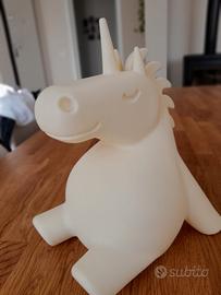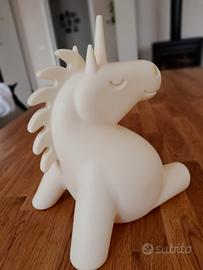 Unicorno per cameretta bambini o ragazzi, illuminabile con led interno a batteria, accendendolo cambia colore [rosso, blu, verde, bianco, giallo). Materiale plastica, altezza 25 cm, larghezza 20 cm.