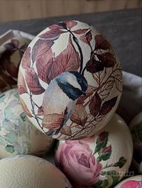 Originali uova di struzzo decorate con vari motivi realizzati con tecnica decoupage