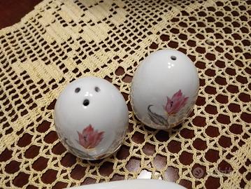 Carinissima coppia di uova 🥚🥚 in porcellana, set sale e pepe, con relativo piattino. Decori floreali e rifiniture in oro zecchino🖌️.