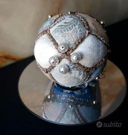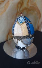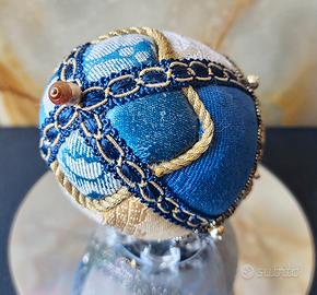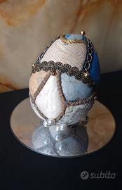 Uovo in tessuto boudoir vintage con steli di perle, decorazione boudoir, fatto a mano in Italia Questo "decoro boudoir aristocratico",estetica reale- è un uovo di Pasqua decorativo vintage, fatto a mano. Questo squisito uovo da interni sembra provenire dal mondo dei boudoir antichi, delle tende di seta e della quieta luce del mattino. Tessuti morbidi, un elegante cordoncino intrecciato con una lucentezza metallica e steli di perle creano l'immagine di un sofisticato oggetto decorativo, che riecheggia l'epoca ispirata alle famose uova di Pasqua Fabergé. Questo pezzo è realizzato in uno stile decorativo vintage popolare tra gli interior designer europei, negli stili shabby chic, vintage romantico, vittoriano/boudoir e pasquale. Questo pezzo trasmette con cura un'atmosfera di lusso intimo, il romanticismo degli interni privati, il gusto per i dettagli e la poesia decorativa. Un uovo del genere potrebbe essere posizionato su una toletta, tra bottiglie di profumo, vecchie lettere e scatole di madreperla. Non urla lusso, sussurra. Materiali e tecnica: tessuto (lino/cotone), cordoncino decorativo con filo metallico e piedini con perline effetto perla. Questi morbidi inserti in tessuto, le finiture decorative in oro e bronzo, abbinate a delicati piedini con perline, creano un look sofisticato e glamour da boudoir. Condizioni: Vintage, buone condizioni; l'arredo è saldamente in posizione, senza deformazioni o perdite di colore. Usi: Decorazione d'interni, decorazioni pasquali, oggetto da esposizione, accento romantico in camera da letto o soggiorno, accessorio fotografico, oggetto decorativo da collezione, regalo per un intenditore di oggetti vintage e insoliti. Misure: altezza - 10/11 cm, diametro - 8 cm