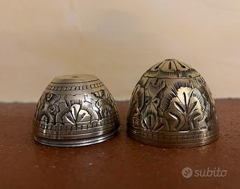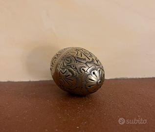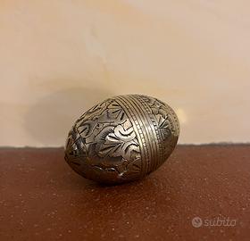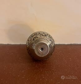 Saliera o Pepiera a forma di uovo in metallo (ottone argentato) con incisioni floreali e geometriche su tutta la superficie. È scomponibile in due metà che si uniscono tra loro tramite un meccanismo a vite. L’emisfero superiore presenta cinque piccoli fori che permettono la fuoriuscita del sale o del pepe contenuto. Un bell’oggetto da collezione ma anche utile e al tempo stesso originale complemento d’arredo per la cucina e la tavola. Dimensioni: diametro 4 cm; altezza 6 cm Peso: 86 g Vintage anni ‘60-‘70 In ottimo stato con minimi segni di ossidazione. Ottimo regalo per collezionisti e buongustai.