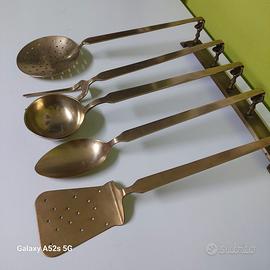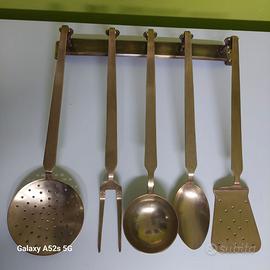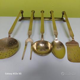vendo set di 5 utensili vintage da cucina con relativo supporto da appendere materiale ottone eventuali spese di spedizione a carico dell'acquirente